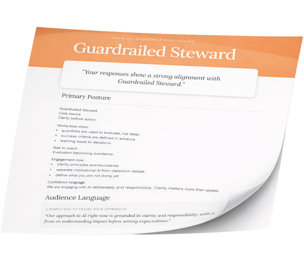A short leadership exercise that brings clarity to how you are leading AI in your school.In about 5–10 minutes, you'll receive a clear leadership posture, adjacent options to consider, and language you can use confidently with boards and faculty.
